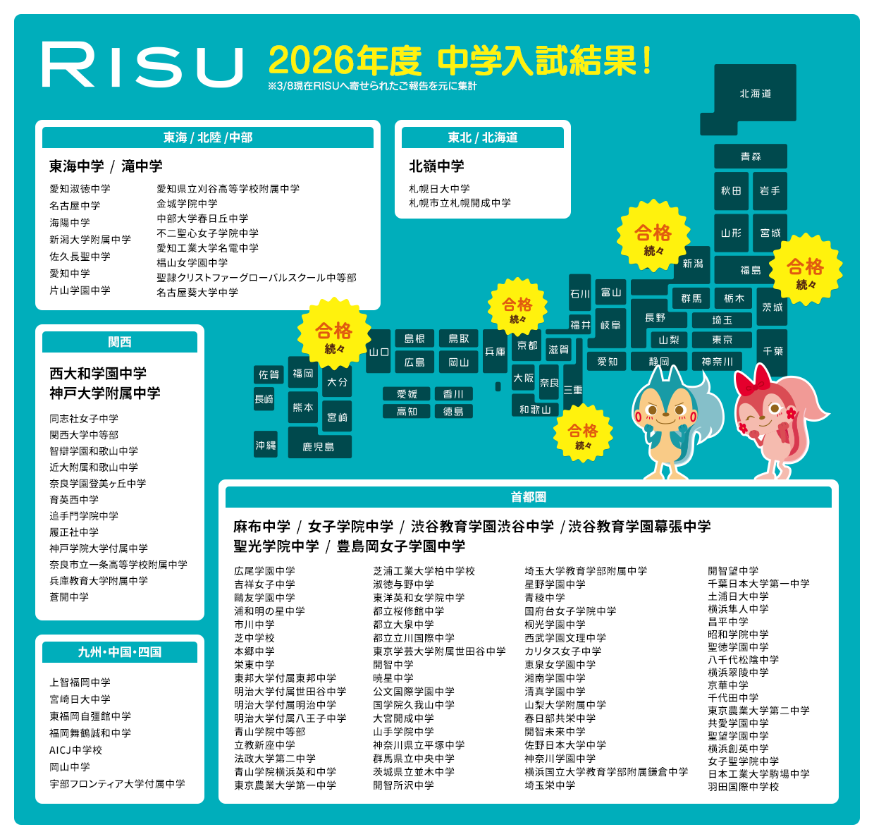 2026年の中学校入試において、RISU算数のご利用者様より全国各地から合格の声を多数お寄せいただいております。