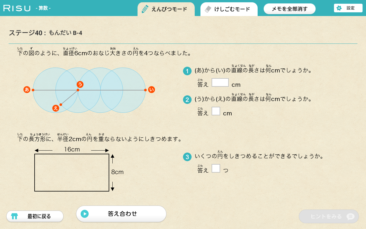 RISU算数では、図形問題や文章問題が基礎から応用まで豊富に出題されます。