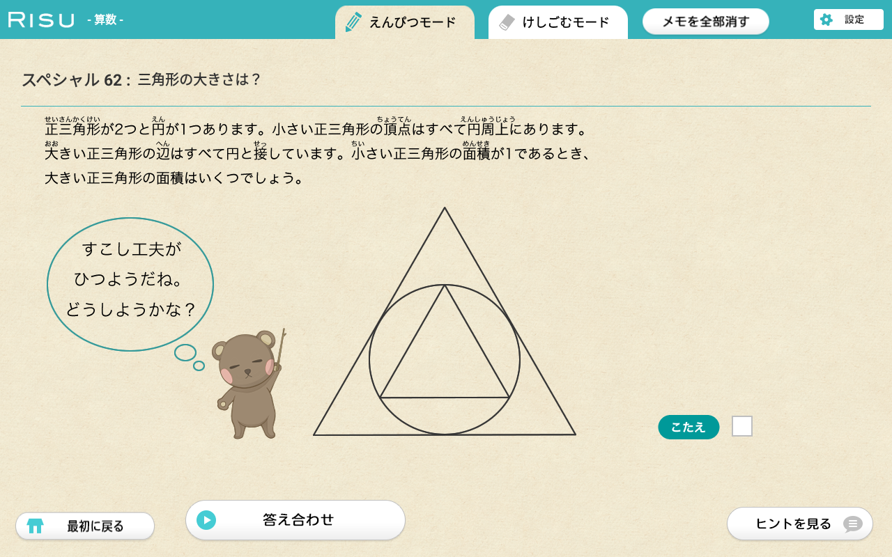RISU算数には基礎問題はもちろん、中学入試や算数オリンピック問題など、思考力を試す問題も多く含まれています。